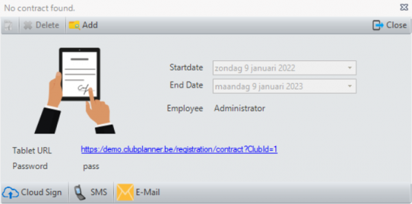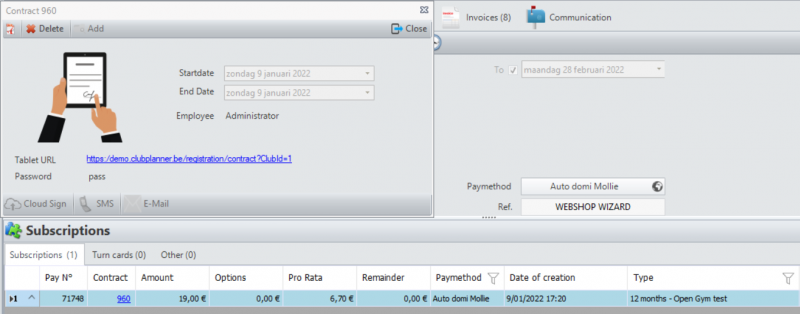 Lorsqu'un abonnement auquel un contrat est lié est mis en ligne, le membre sera invité à signer le contrat lors de l'achat dans le webshop. Le membre recevra alors un courriel dans lequel le contrat signé est joint.