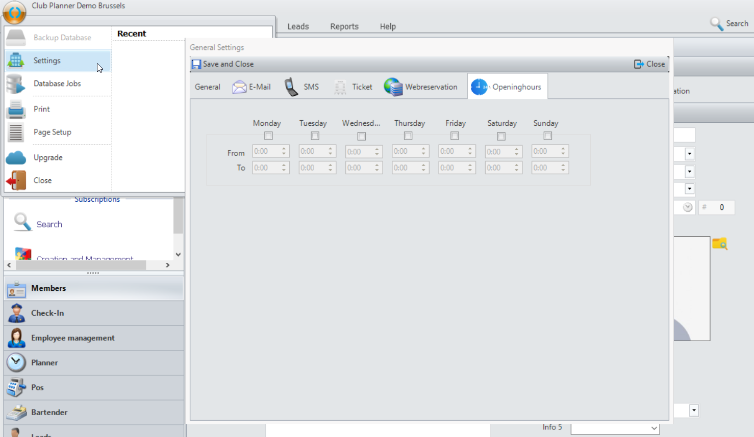 Openingsuren stel je in door linksboven op het Club Planner logo te klikken en voor “Instellingen” te kiezen. In het venster dat zich nu opent kan je de openingsuren per dag instellen onder tabblad “Openingsuren”.
