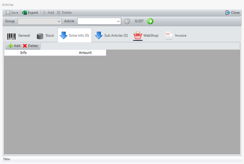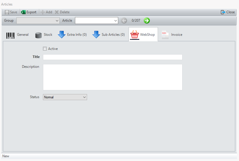 | Omschrijving | Geef een omschrijving van het artikel. | Status | Normal: geen effect op het artikel. |