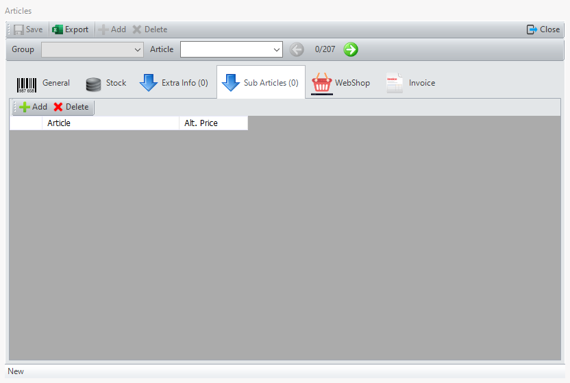 | Omschrijving | Omschrijving van het artikel. | Groep | Bar groep waarin het artikel ingedeeld wordt. |