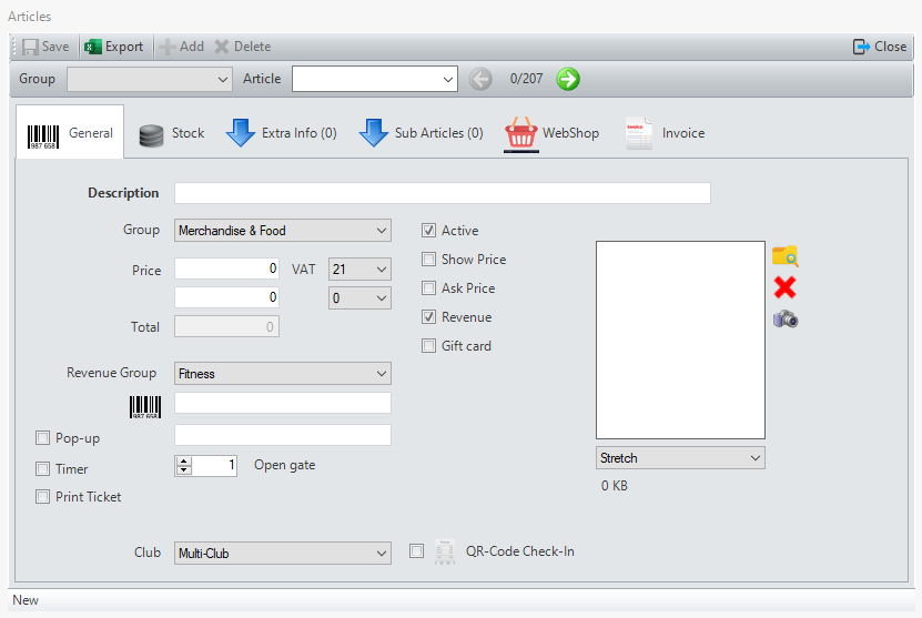 | Omzet | Vink aan om de verkoop van het artikel in de omzet op te nemen. | Afbeelding | Een afbeelding toevoegen doe je door op het dossier-icoon te klikken en een afbeelding op je pc te selecteren. Wanneer een camera aangesloten zit aan je pc kan je ook op het camera-icoon klikken om op deze manier een afbeelding toe te voegen. Onder de afbeelding kan je de positionering bepalen. |