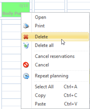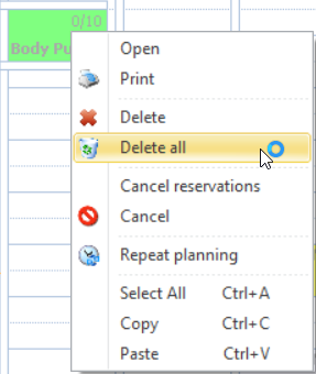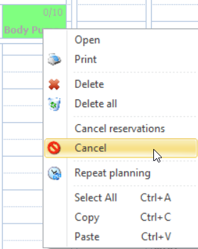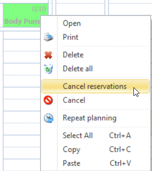 Om alle reservaties voor een bepaalde activiteit te annuleren selecteer je deze, rechtermuisklik je op de activiteit en kies je “Reservaties Annuleren”. Na annulatie zal Club Planner vragen of je deze mensen op de hoogte wil brengen via mail.