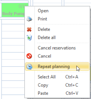 Selecteer alle activiteiten die je wil herhalen (ctrl + a om alles binnen het huidige overzicht te selecteren), rechtermuisklik op 1 van de geselecteerde activiteiten en kies de optie “Herhaal Planning”.