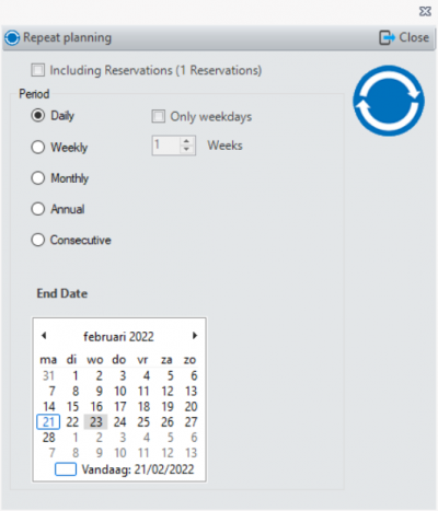 | Inclusief Reservaties | Indien aangevinkt worden de reservaties voor de geselecteerde activiteiten ook herhaald. |
