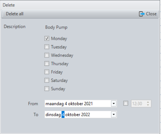 In het venster dat zich nu opent kan je aangeven op welke dagen deze activiteit(en) verwijdert moeten worden, gedurende welke periode en eventueel op welk tijdstip.