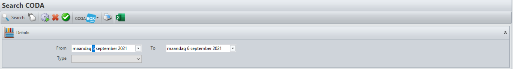 Printen | Druk de geselecteerde SEPA/Coda af. | Exporteren naar Excel | Exporteer de gegevens van alle opgezochte Coda's en SEPA's. |