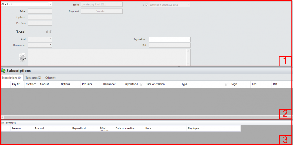 Tabblad Abonnementen wordt onderverdeeld in 3 delen: