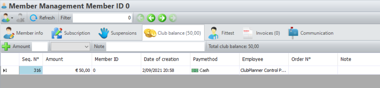 Clubsaldo toevoegen | Geef het toe te voegen saldo in naast bedrag en selecteer een betaalwijze naast het bedrag. Klik vervolgens op het plusteken om het saldo toe te voegen. Tip: indien een lid per ongeluk Club Saldo heeft aangekocht en je dit wil resetten kan je het toegevoegde bedrag tegenboeken door een negatief bedrag toe te voegen aan het saldo (vb. -100). Aangezien dit niet tot de omzet gerekend wordt, zal dit geen invloed hebben op je omzetrapport. |