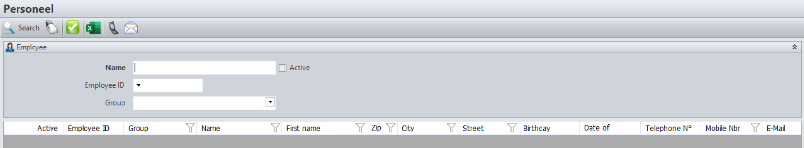 Exporteren naar Excel | Exporteer alle resultaten naar Excel. | SMS/Mail | Stuur een mail of sms uit naar de geselecteerde personeelsleden. |