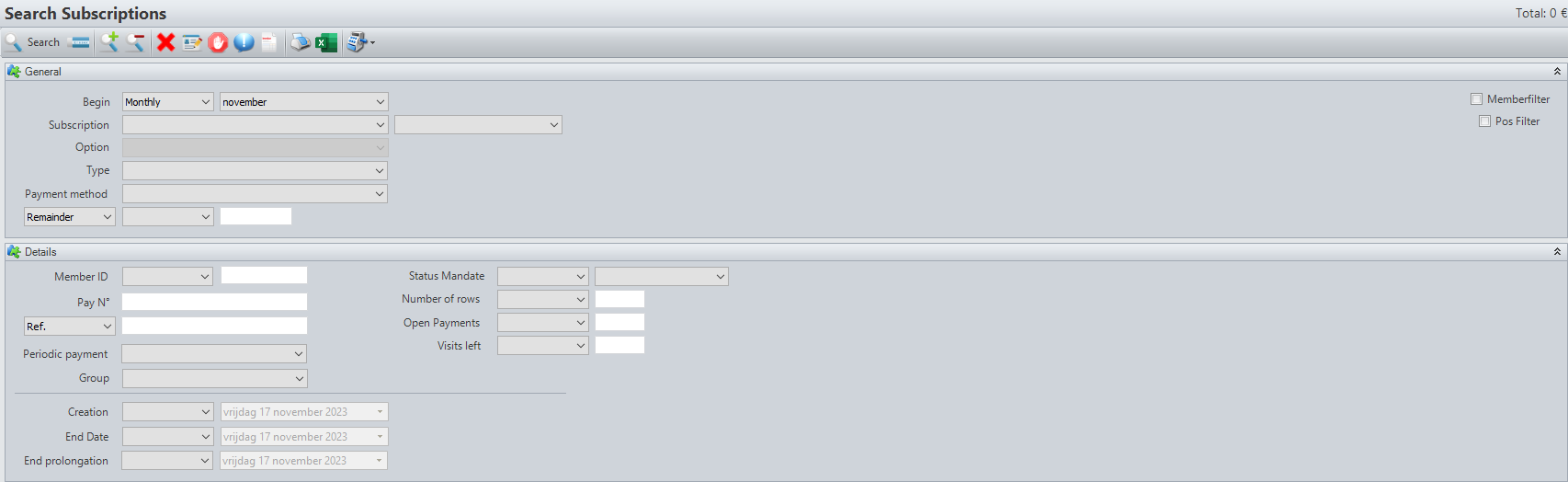 Kassa | Markeer als betaald: vereffen het openstaand saldo van geselecteerde abonnementslijnen. | Exporteren naar Excel | Exporteer de gegevens van alle geselecteerde abonnementslijnen naar Excel. |